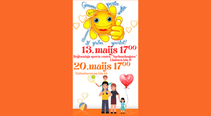 13. maijā no plkst.17.00 līdz plkst.19.00 Ģimeņu sporta svētkos “Mammu, tēti gribu sportot!” Sarkandaugavā Rīgas bērnu un jauniešu centrā “Laimīte” Reģionālajā sporta centrā “Sarkandaugava”, Limbažu ielā 8, Rīgā. Un 20. maijā no plkst.17.00 līdz plkst.19.00 Ģimeņu sporta svētkos “Mammu, tēti gribu sportot!”...