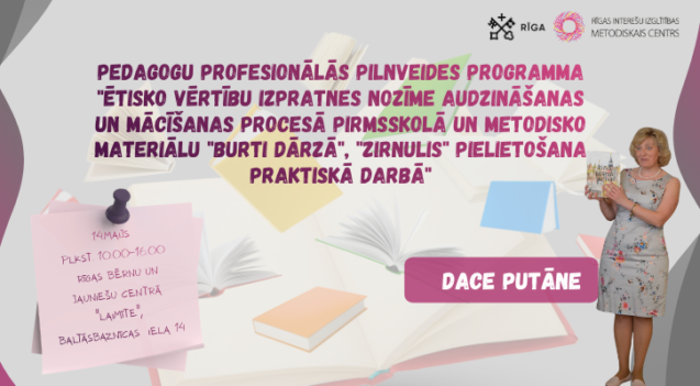 Rīgas Interešu izglītības metodiskais centrs aicina interešu izglītības pedagogus piedalīties profesionālās kompetences pilnveides programmā “Ētisko vērtību izpratnes nozīme audzināšanas un mācīšanas procesā pirmsskolā un metodisko materiālu “Burti dārzā” un “Zirnulis” pielietošana praktiskā darbā”, kas notiks 2026. gada 14. maijā no plkst. 10.00 līdz 16.00 Rīgas Bērnu un jauniešu centrā “Laimīte”, Baltāsbaznīcas ielā 14, Rīgā.