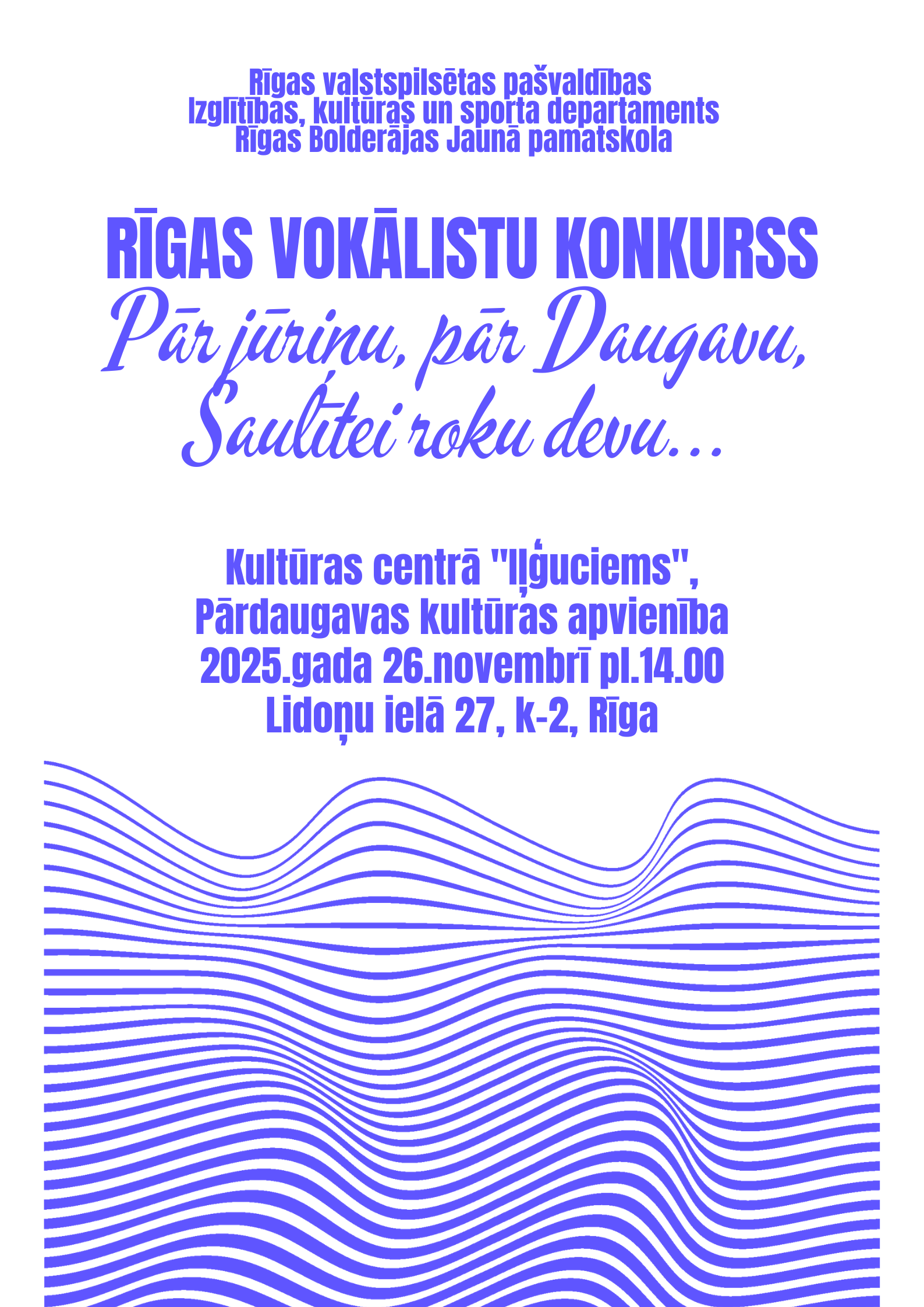 Aicinām visus dziedāt mīlošos, sākumskolas un pamatskolas vecuma solistus un vokālo ansambļu dalībniekus, piedalīties Rīgas vokālistu konkursā “Pār jūriņu, pār Daugavu, Saulītei roku devu…”, kas norisināsies 2025. gada 26. novembrī no plkst. 14.00, Pārdaugavas kultūras apvienības Kultūras centrā “Iļģuciems”, Lidoņu ielā 27, k-2, Rīgā.