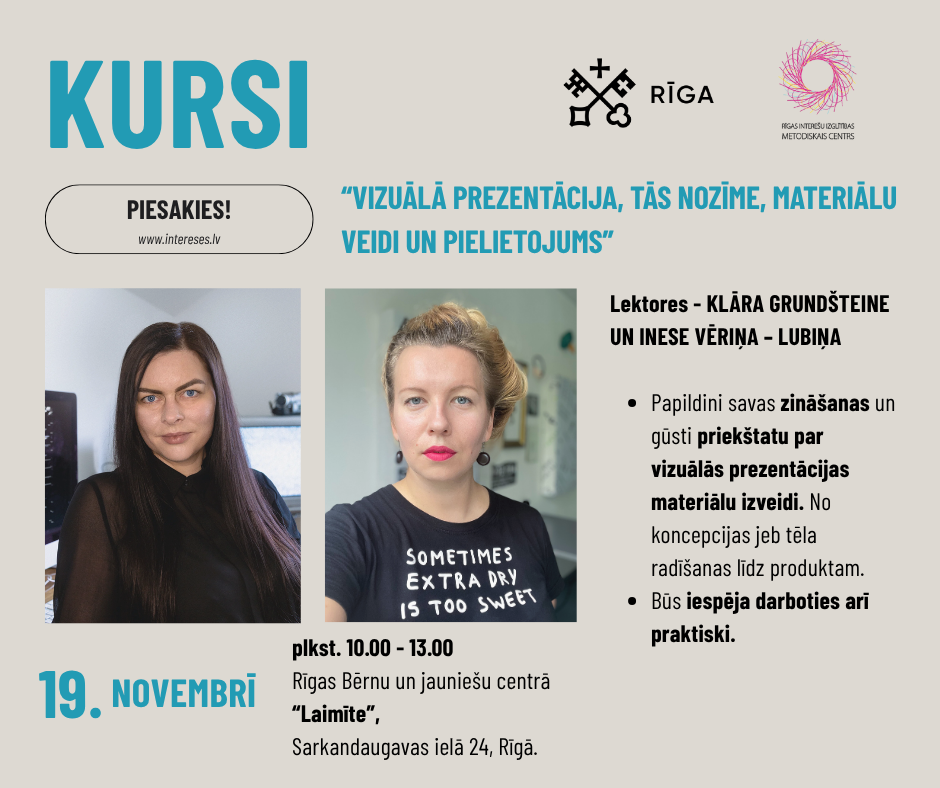 Rīgas Interešu izglītības metodiskais centrs aicina pieteikties interešu izglītības programmu pedagogus, kā arī iestāžu izglītības metodiķus, pedagogu profesionālās kompetences pilnveides programmas “Vizuālā prezentācija, tās nozīme, materiālu veidi un pielietojums” (4 stundas) apguvei, kas norisināsies 2025. gada 19. novembrī no plkst. 10.00 – 13.00 Rīgas Bērnu un jauniešu centrā “Laimīte”, Sarkandaugavas ielā 24, Rīgā.