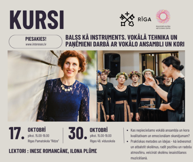 Rīgas Interešu izglītības metodiskais centrs aicina pieteikties pedagogu profesionālās kompetences pilnveides 16 stundu programmai “Balss kā instruments. Vokālā tehnika un paņēmieni darbā ar vokālo ansambli un kori”. Kursu lektores – Inese Romancāne un Ilona Plūme.