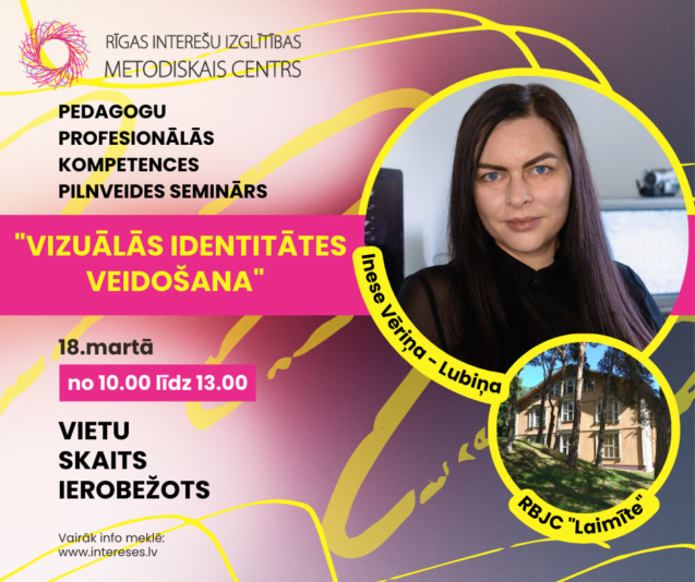 Rīgas Interešu izglītības metodiskais centrs aicina Rīgas pašvaldības izglītības iestāžu interešu izglītības skolotājus pieteikties pedagogu profesionālās kompetences pilnveides semināra “Vizuālās identitātes veidošana” apguvei. Programma norisināsies 2026. gada 18. martā no plkst. 10.00 līdz 13.00, lektore – Inese Vēriņa-Lubiņa.