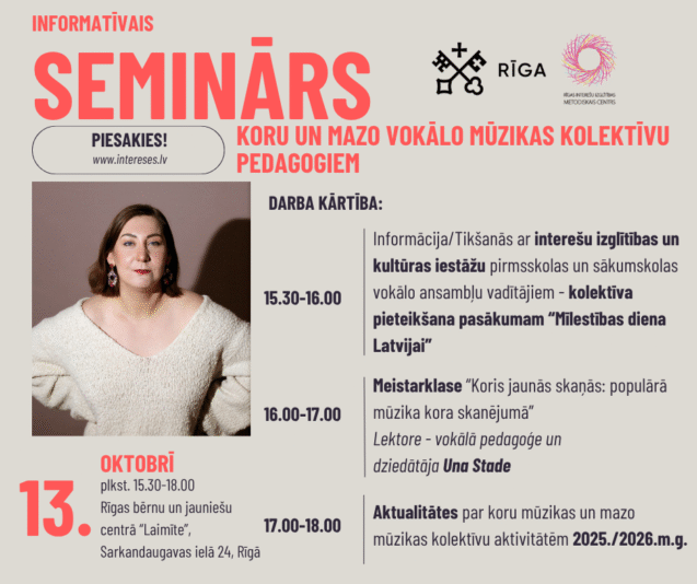 Rīgas Interešu izglītības metodiskais centrs 2025. gada 13. oktobrī no plkst. 15.30 līdz plkst. 18.00 Rīgas Bērnu un jauniešu centrā “Laimīte”, Sarkandaugavas ielā 24, Rīgā, rīko Rīgas valstspilsētas pašvaldības izglītības iestāžu, interešu izglītības iestāžu un kultūras iestāžu koru un mazo vokālo mūzikas kolektīvu pedagogu informatīvo sanāksmi – semināru.