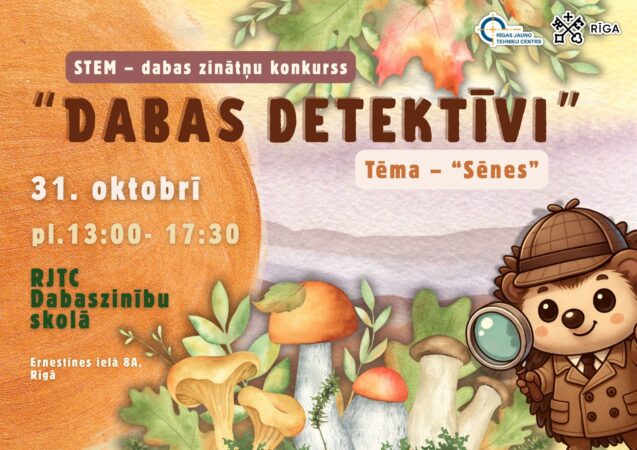 Rīgas Jauno tehniķu centrs sadarbībā ar Rīgas valstspilsētas pašvaldības Izglītības, kultūras un sporta departamentu aicina 1. – 9. klašu skolēnus piedalīties STEM – dabas zinātņu konkursā “Dabas detektīvi” par tēmu “Sēnes”, kurš norisināsies 2025. gada 31. oktobrī, Rīgas Jauno tehniķu centra struktūrvienībā “Rīgas Dabaszinību skolā”, Ernestīnes ielā 8A, Rīgā.