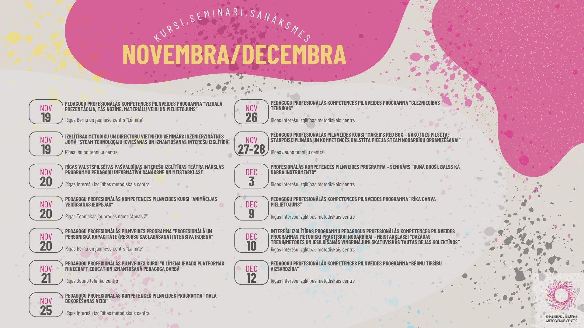 Rīgas Interešu izglītības metodiskais centrs aicina iepazīties ar visiem 2025. gada novembrī un decembrī plānotajiem kursiem, semināriem un sanāksmēm vienuviet. Kursi, semināri un sanāksmes plānotas dažādās jomās – STEM, tautas dejas, vizuālās un vizuāli plastiskās mākslas, teātra, kā arī kopīgās tālākizglītības jomā. Apskati, ieplāno un tiekamies kādā no pedagogu pilnveides semināriem, kursiem un sanāksmēm!