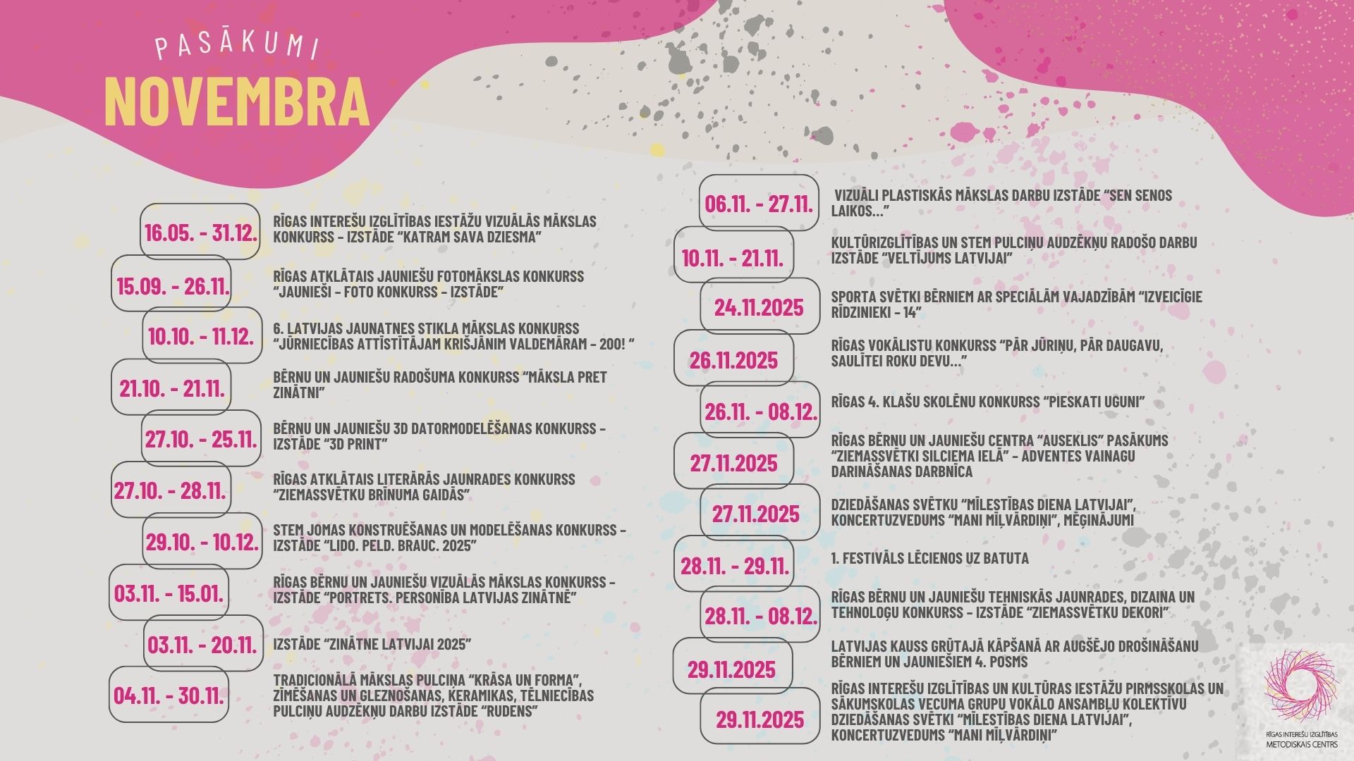 Rīgas Interešu izglītības metodiskais centrs aicina iepazīties ar visiem 2025. gada novembrī plānotajiem pasākumiem interešu izglītībā vienuviet. Dažādās jomās plānoti tādi pasākumi kā sacensības, konkursi un skates, izstādes, koncerti un arī Ziemassvētku pasākumi. Apskati, ieplāno un tiekamies kādā no interešu izglītības pasākumiem!