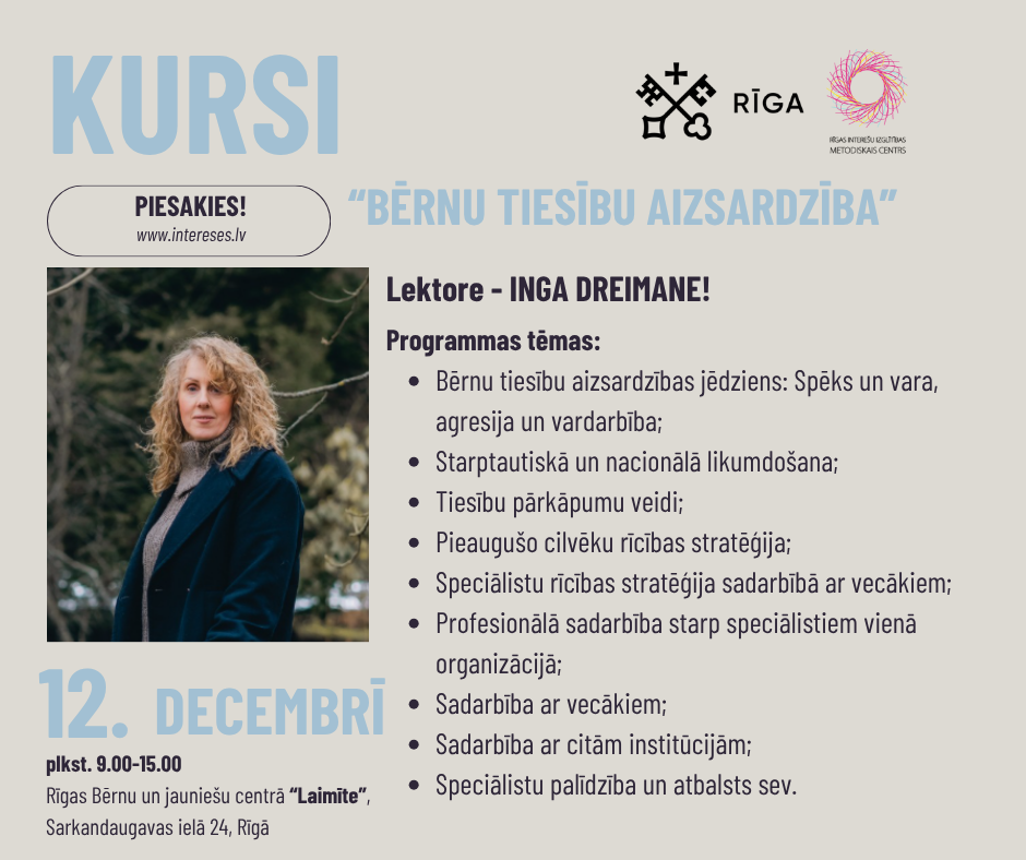 Rīgas Interešu izglītības metodiskais centrs aicina pieteikties interešu izglītības programmu pedagogus profesionālās kompetences pilnveides programmas “Bērnu tiesību aizsardzība” (8 stundas) apguvei. Programma norisināsies 2025.gada 12. decembrī no 9.00-15.00, Rīgas Bērnu un jauniešu centrā “Laimīte”, Sarkandaugavas iela 24 , Rīga.