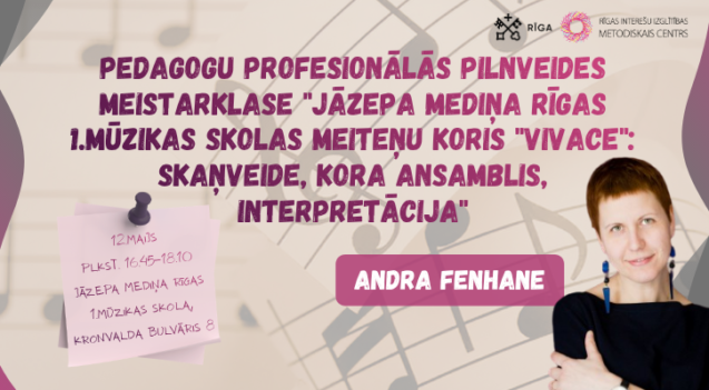 Rīgas Interešu izglītības metodiskais centrs organizē pedagogu profesionālās kompetences pilnveides meistarklasi, kurā piedalīsies Jāzepa Mediņa Rīgas 1. mūzikas skola meiteņu koris “Vivace”, kurš sniegs dalībniekiem vērtīgu iespēju padziļināt savas vokālās un muzikālās prasmes profesionālā un radošā vidē. Nodarbība būs veltīta trim būtiskām kora mākslas jomām — skaņveidei, kora ansamblim un muzikālajai interpretācijai.