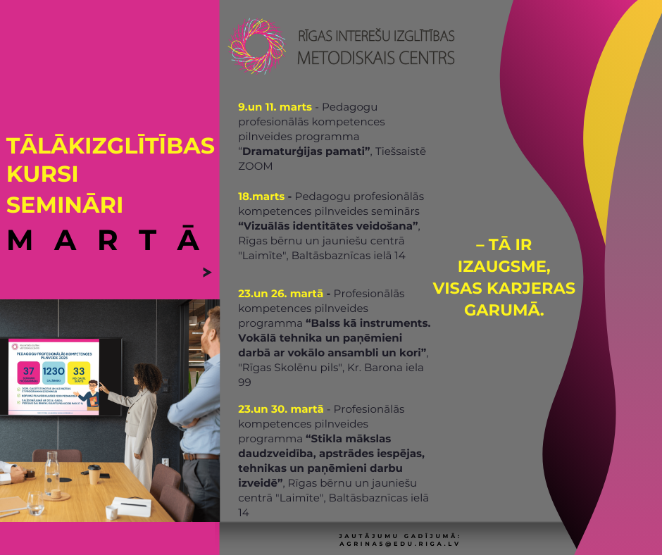 Rīgas Interešu izglītības metodiskais centrs aicina Rīgas valstspilsētas pašvaldības interešu izglītības pedagogus piedalīties pedagogu profesionālās kompetences pilnveides programmās un semināros! Nepalaid garām iespēju – vēl ir brīvas vietas!