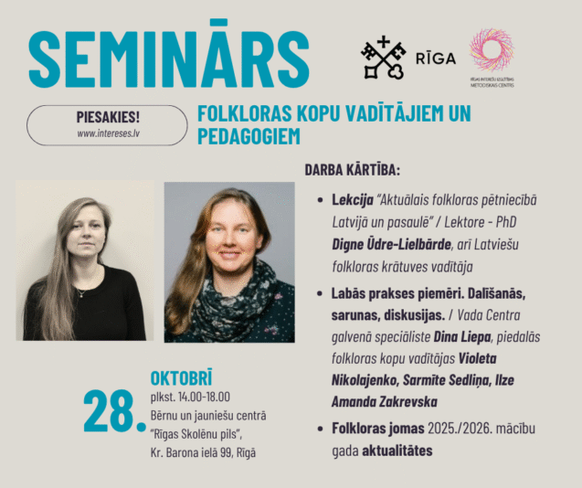 Rīgas Interešu izglītības metodiskais centrs rīko Rīgas valstspilsētas pašvaldības iestāžu interešu izglītības bērnu un jauniešu folkloras kopu vadītāju un pedagogu informatīvo semināru 2025. gada 28. oktobrī no plkst. 14.00 līdz plkst. 18.00 Bērnu un jauniešu centrā “Rīgas Skolēnu pils”, Krišjāņa Barona ielā 99, Rīgā.