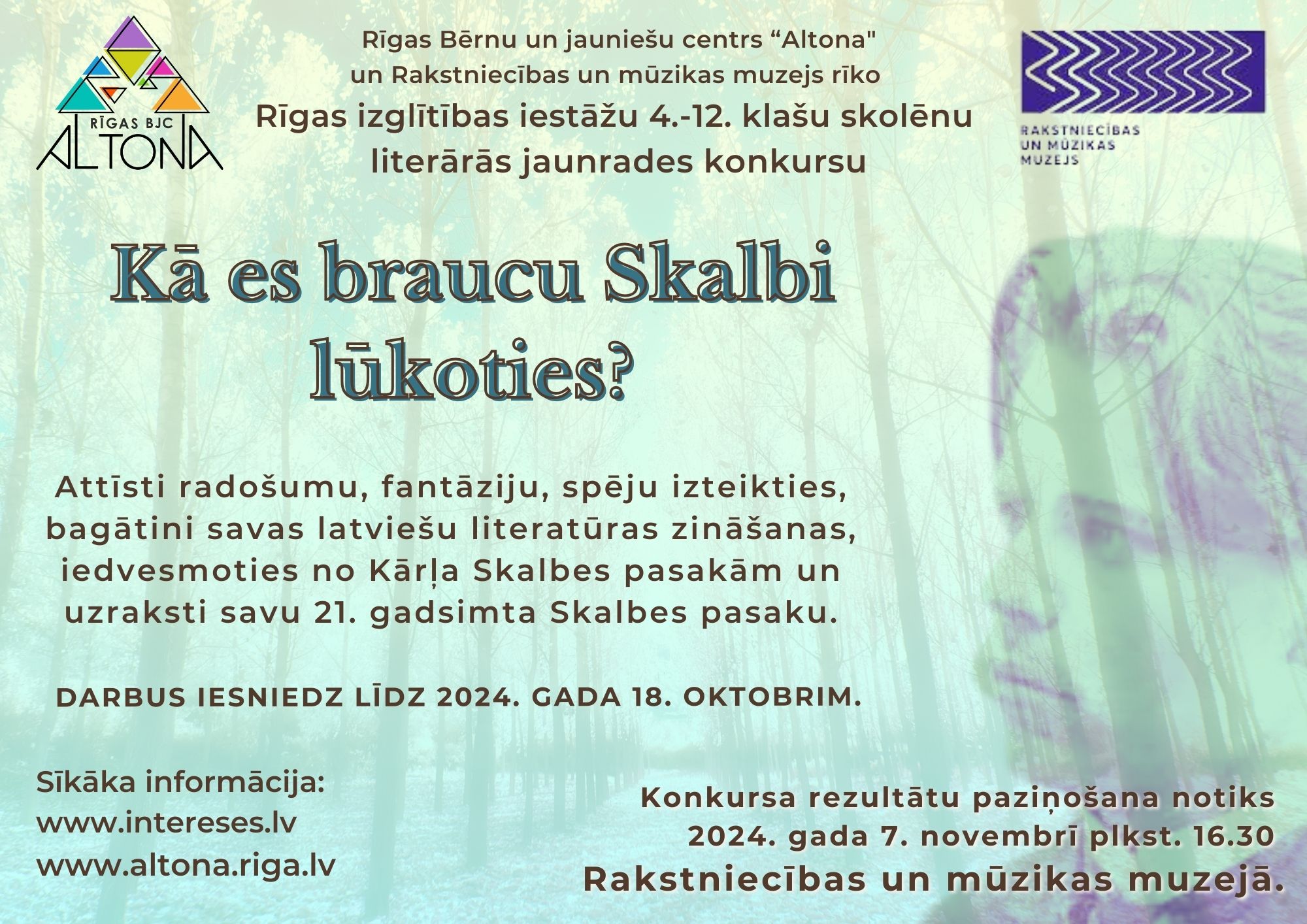 Rīgas bērnu un jauniešu centrs “Altona” un Rakstniecības un mūzikas muzejs rīko Rīgas izglītības iestāžu literārās jaunrades konkursu “Kā es braucu Skalbi lūkoties?”.