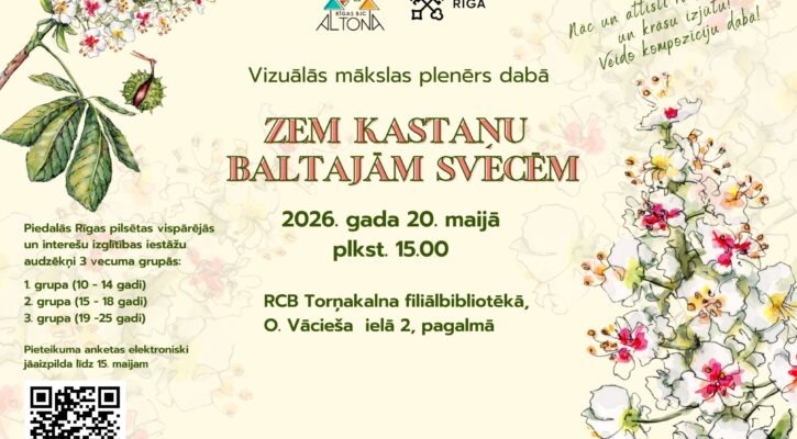 Ir atnācis pavasaris – skaistais ziedēšanas laiks! Mēs atkal tiksimies mākslā – Vizuālās mākslas plenērā “Zem kastaņu baltajām svecēm”. Plenēra mērķis ir attīstīt radošo iztēli, krāsu izjūtu un pilnveidot prasmes veidot kompozīciju dabā. Plenēru organizē Rīgas bērnu un jauniešu centrs “Altona”...