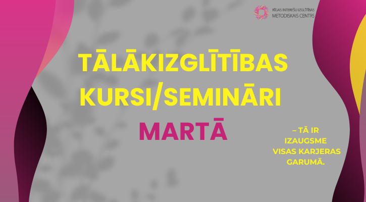 Rīgas Interešu izglītības metodiskais centrs aicina Rīgas valstspilsētas pašvaldības interešu izglītības pedagogus piedalīties pedagogu profesionālās kompetences pilnveides programmās un semināros! Nepalaid garām iespēju – vēl ir brīvas vietas! Piesakies Rīgas Interešu izglītības metodiskā centra organizētajām aktivitātēm: 9. un 11. martā profesionālās kompetences...