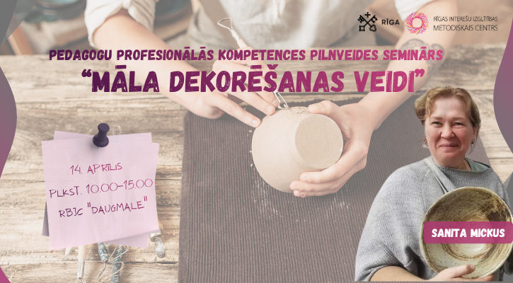 Rīgas Interešu izglītības metodiskais centrs aicina interešu izglītības pedagogus pieteikties profesionālās kompetences pilnveides semināram “Māla dekorēšanas veidi” (6 stundas). Par semināru: Semināra dalībnieki iepazīs dažādas māla dekorēšanas tehnikas un saņems metodiskus ieteikumus to apguvei. Tiks apgūtas tādas tehnikas kā sgraffito, gleznošana ar...