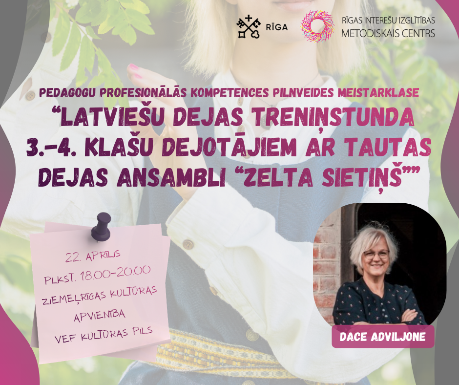 Aicinām Rīgas valstspilsētas pašvaldības tautas deju kolektīvu pedagogus 22. aprīlī piedalīties pedagogu profesionālās pilnveides meistarklasē “Latviešu dejas treniņstunda 3.–4. klašu dejotājiem ar tautas dejas ansambli “Zelta sietiņš””.