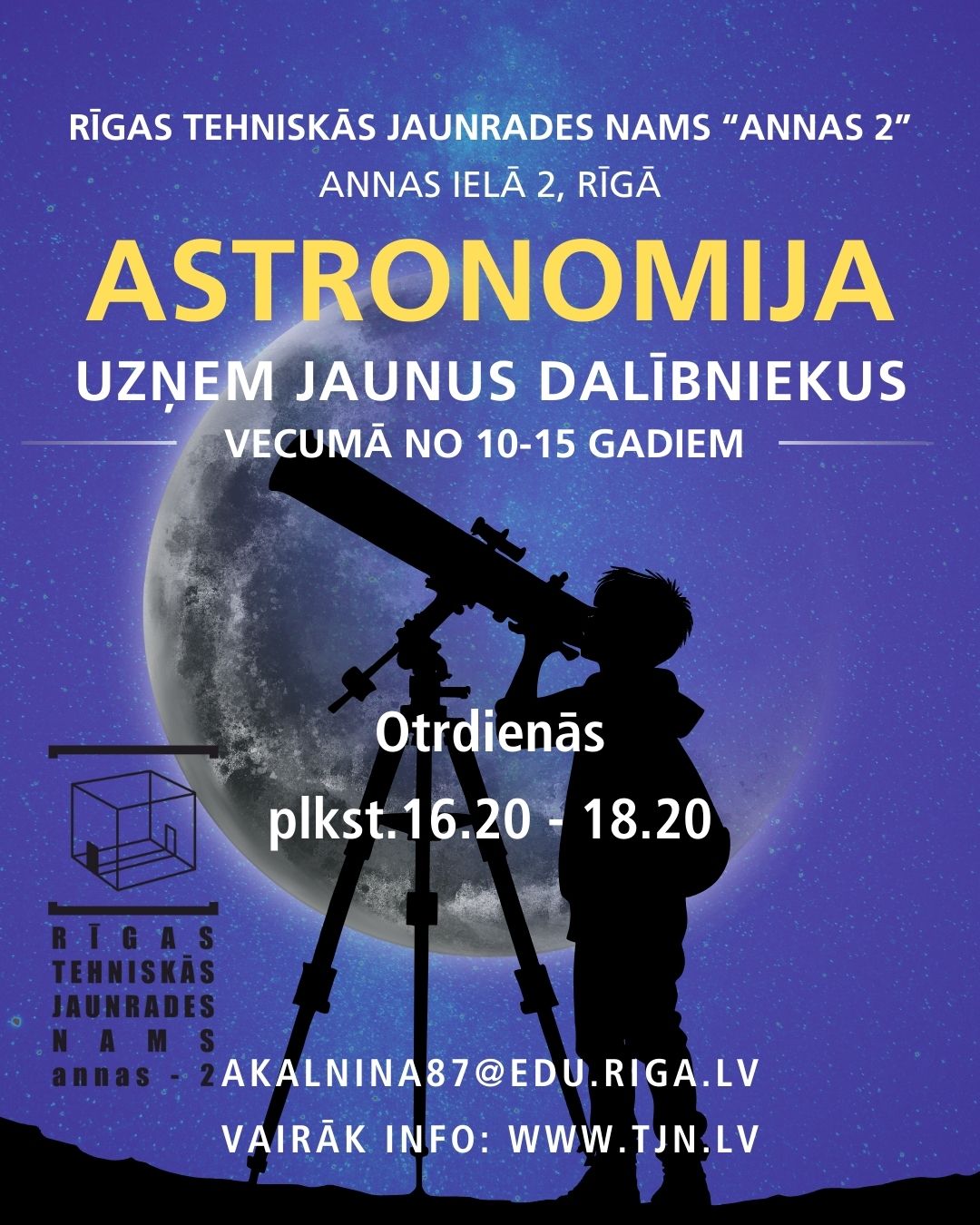 Jauns gads – jauna apņemšanās! Piemēram, padziļināti apgūt astronomijas zinātni? Astronomijas pulciņa skolotāja Aija Kalniņa aicina audzēkņus vecumā no 10 – 15 gadiem pieteikties nodarbībām otrdienās no plkst. 16.20 līdz 18.20 Rīgas Tehniskās jaunrades namā “Annas 2”.