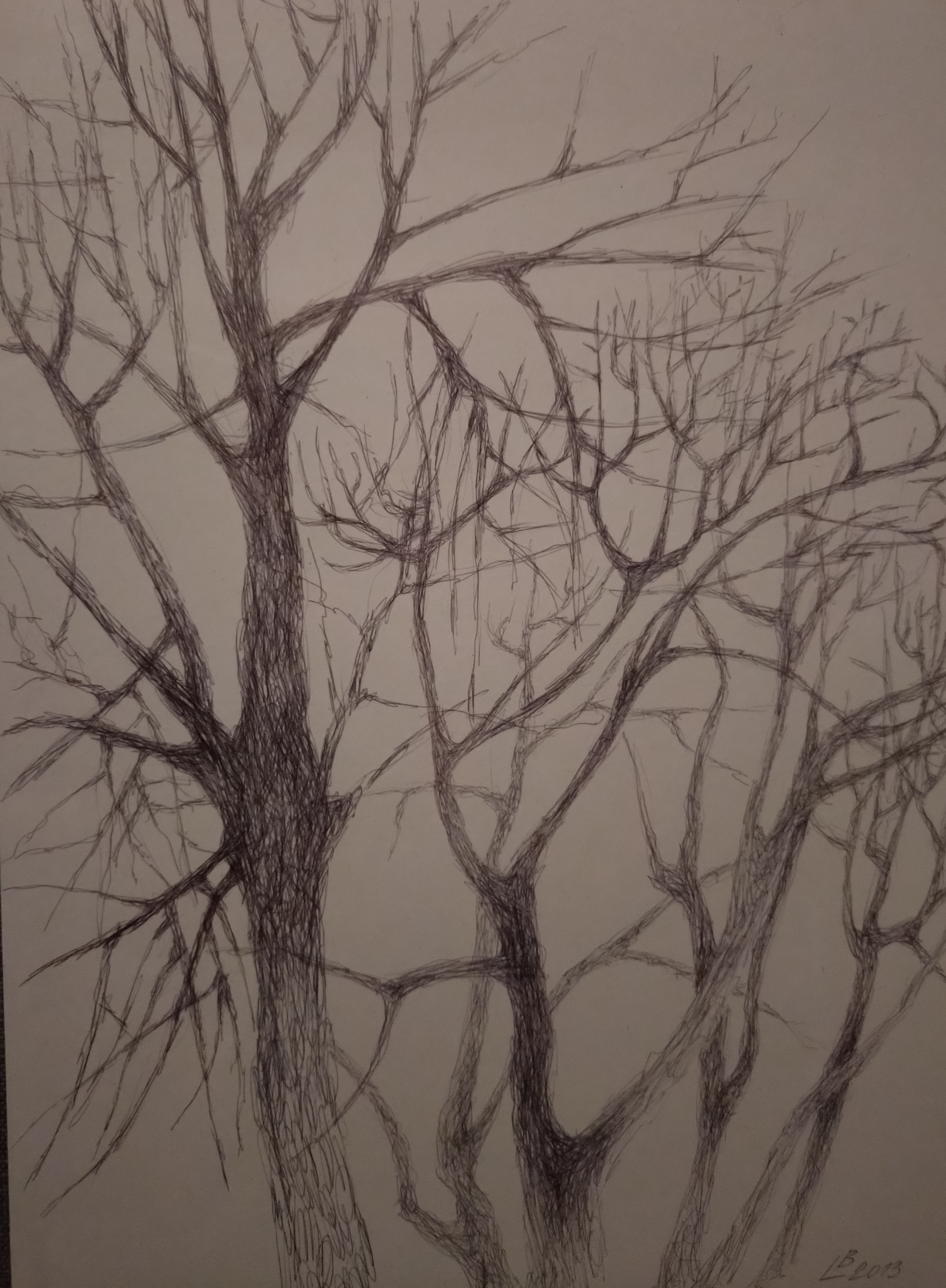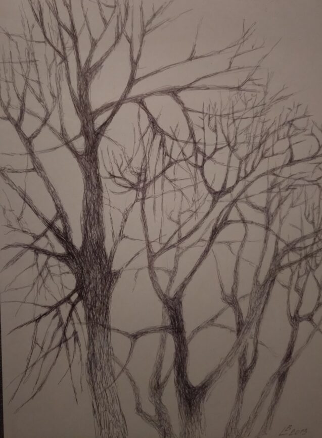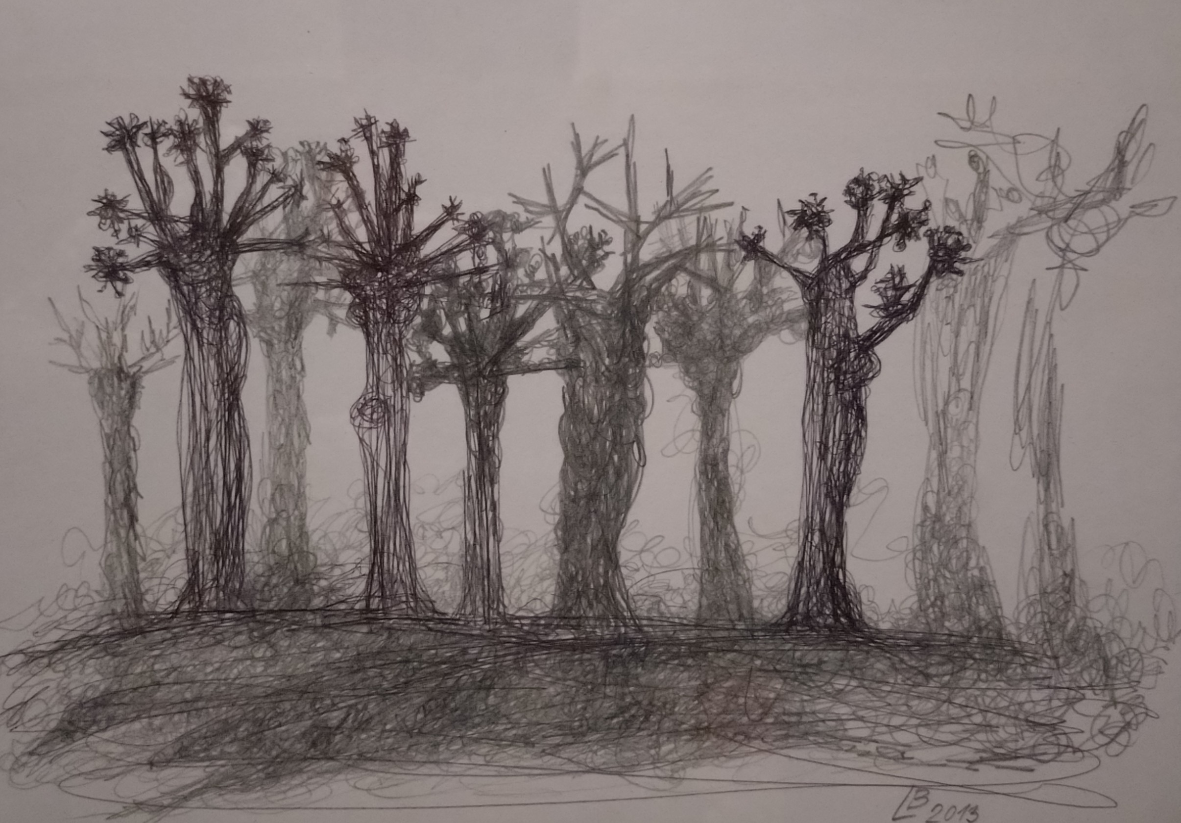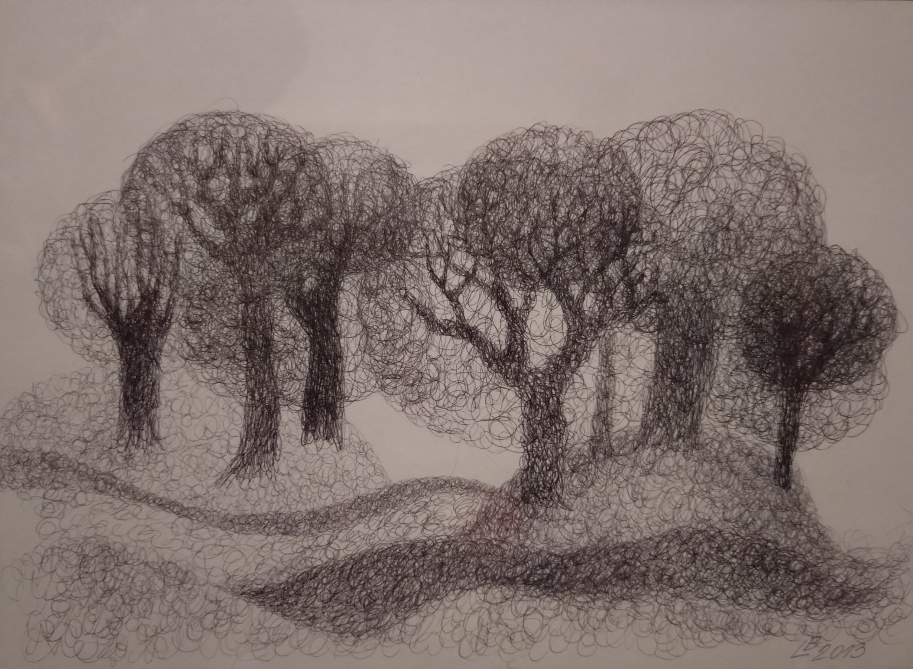 Labi izdodas skribelēšanas tehnikā zīmēti koki.