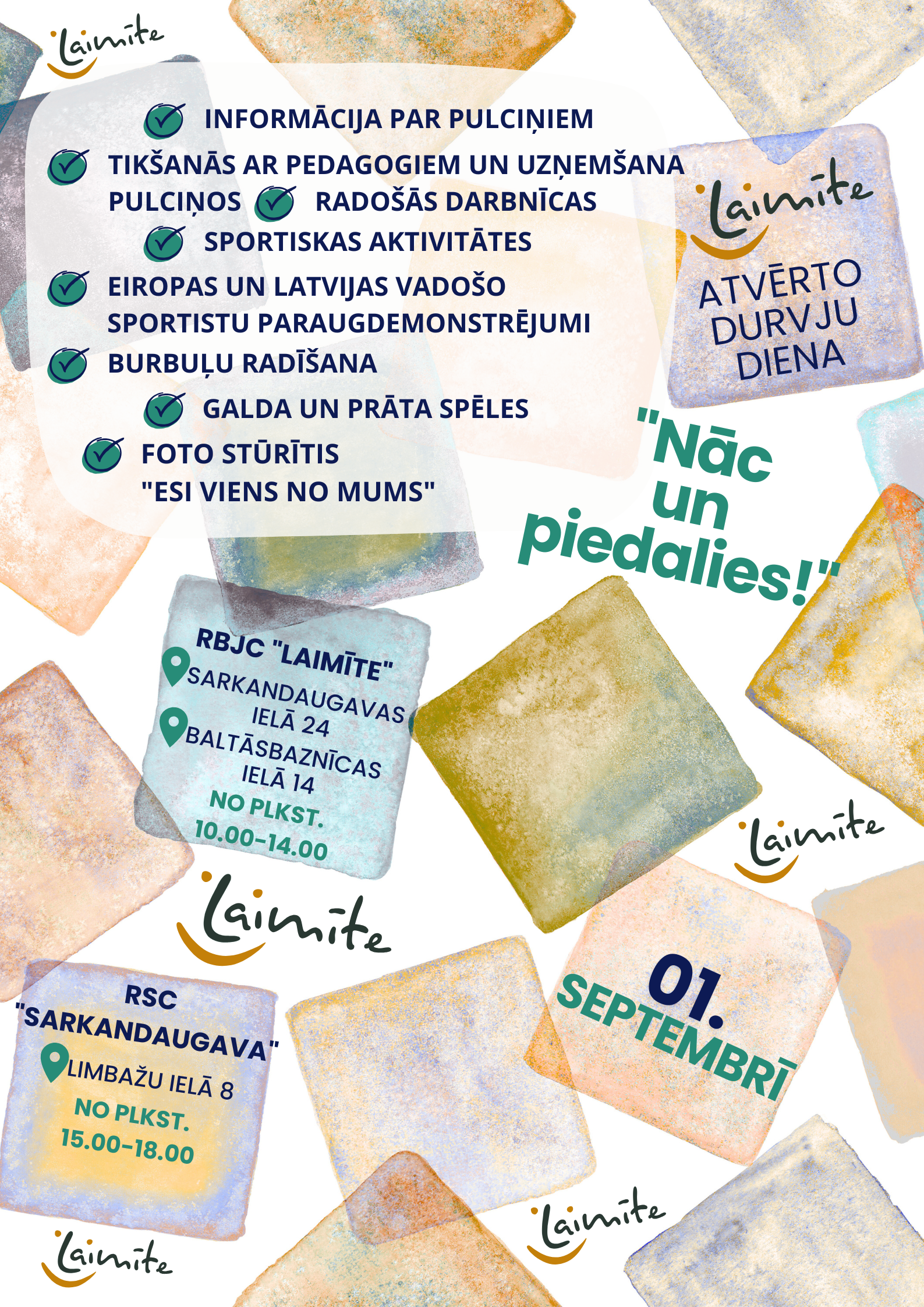 2025. gada 1.septembrī, Zinību dienā, ienāc Rīgas bērnu un jauniešu centrā “Laimīte” , Sarkandaugavas ielā 24 un Baltāsbaznīcas ielā 14, no plkst. 10.00 – 14.00, bet no plkst. 15.00 – 18.00 reģionālajā sporta centrā “Sarkandaugava” , Limbažu ielā 8!