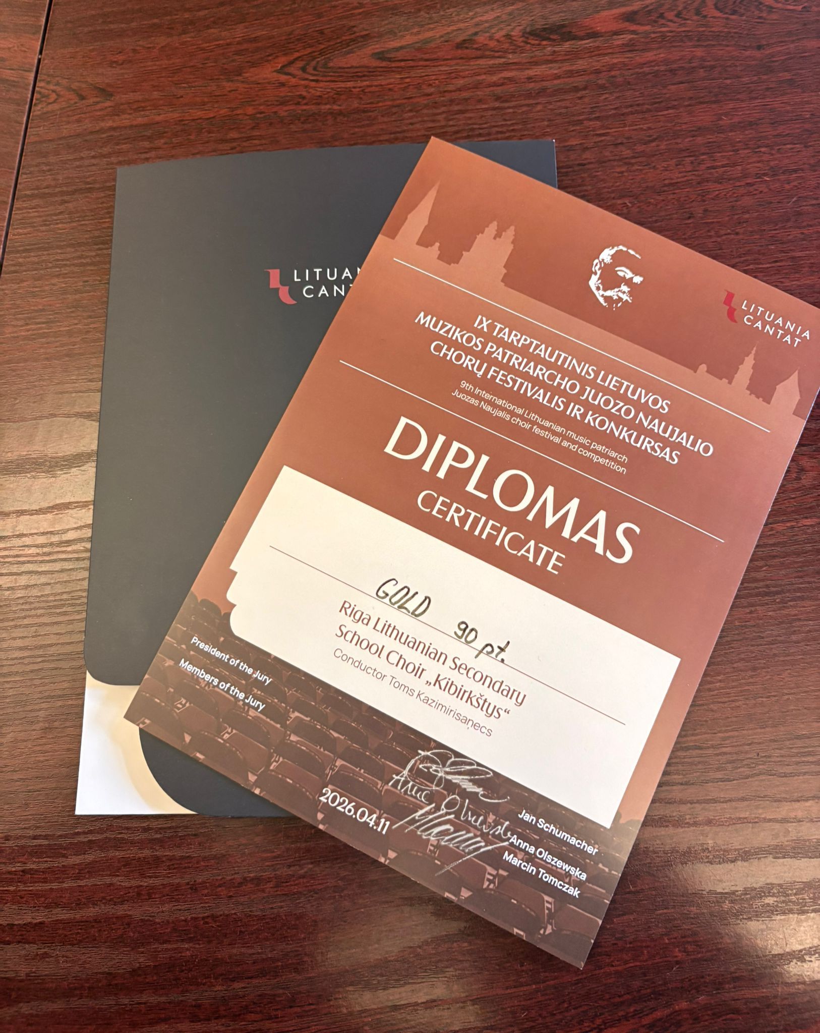 Sirsnīgi un ar patiesu gandarījumu sveicam Rīgas Lietuviešu vidusskolas 5.–12. klašu kori “Kibirkštys” ar izciliem panākumiem Joza Naujāļa starptautiskajā koru konkursā Lietuvā, kur koris ieguvis zelta diplomu! Šis sasniegums ir apliecinājums kora augstajai kvalitātei, profesionālajam sniegumam un radošajam garam.