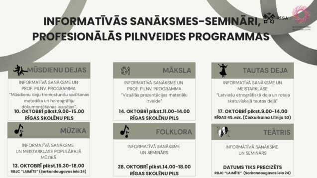 17. oktobrī no plkst. 9.00 līdz 14.00 Rīgas 45. vidusskolā, Čiekurkalna 1. līnija 53, notiks Rīgas valstspilsētas pašvaldības izglītības iestāžu interešu izglītības tautas deju kolektīvu vadītāju un pedagogu informatīvā sanāksme – seminārs un meistarklase “Latviešu etnogrāfiskā deja un rotaļa skatuviskajā tautas dejā” (lektore- Dace Smirnova).