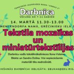 2024.gada 14. martā plkst. 11.30-13.00 mūsu Tehniskās jaunrades nama “Annas 2” skolotājas, arī tekstilmākslinieces, Ilona Valaine-Blekte un Sandra Dzilna vadīs radošu darbnīcu “Tekstila mozaīkas un miniatūrtekstīlijas” izstādes “Annas MEŽS” ietvaros. Darbnīcā aicināti bērni vecumā no 7-11 gadiem. Visi materiāli tiks nodrošināti. Norises...